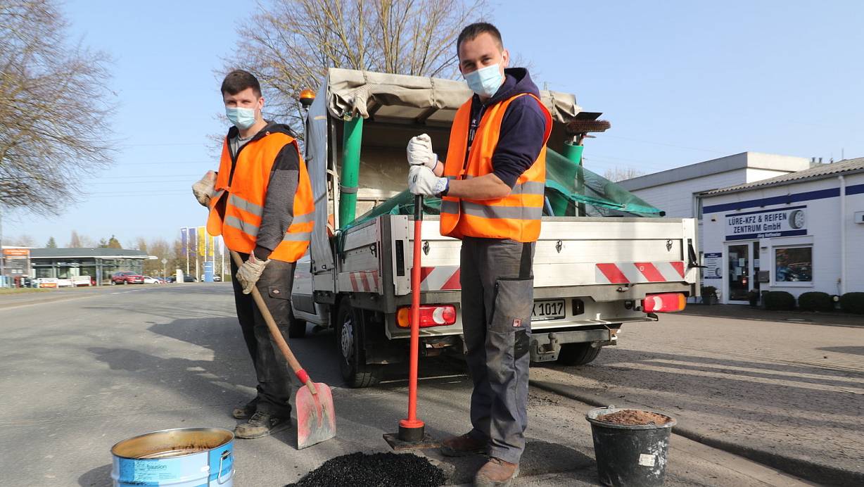 In der Lüre kümmern sich Alexander Hölting (l.) und Marvin Köhne it Kaltasphalt um ein Schlagloch in der Fahrbahn. | © Simone Flörke
