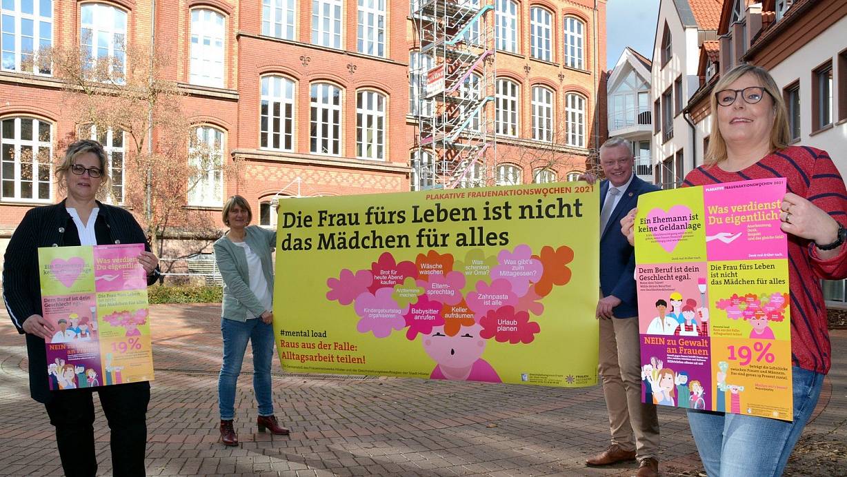 Barbara Fien, Claudia Pelz-Weskamp, Daniel Hartmann und Silke Winter-Schrader zeigen die Plakate der „Plakativen Frauenaktionswochen 2021". | © Thomas Kube