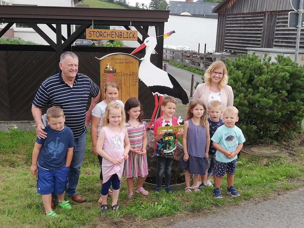 Es sollten jedoch nicht nur die Namen in feierlichem Rahmen verkündet werden. Mit der Festtafel sollte ebenfalls die Arbeit gewürdigt werden, die in die Instandhaltung des Storchennestes fließt. Noch bevor die Störche aus dem Winterquartier zurückkommen, müsse das Nest mit Hilfe eines Krans gereinigt werden. Der Fortgang der Brut werde zwei bis drei Mal im Jahr mit einer Drohne kontrolliert, in diesem Jahr sei auch noch eine Überprüfung des Nests hinzugekommen, da vermutet wurde, dass die Storche Plastik mit eingearbeitet haben. Zum Abschluss der Brutzeit müsse dann das Storchenschild des Kindergartens auf den neuesten Stand gebracht werden. Dank dieser Mühe, können auch im kommenden Jahr wieder Küken schlüpfen. Wer weiß, wie viele Namen dann von den Kindern ausgesucht werden können.