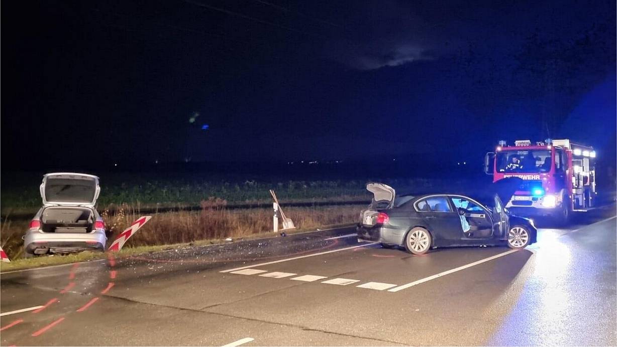 Ein Fahrzeug (BMW) blieb auf der Straße stehen, während der zweite Wagen (VW-Golf) in den Straßengraben geschleudert wurde. Der Golf, der in den Graben geschleudert worden ist, beschädigte gleich mehrere Schilder an der Kreuzung, die er allesamt unter sich begrub.