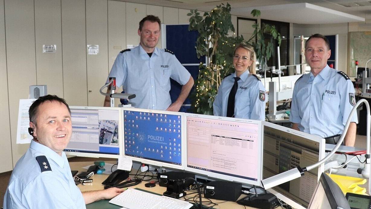 Dirk Kaufmann (v. l.), Sebastian Müller, Corinna Föckel und Alfred Menzel sorgen in der Leitstelle mit ihren Kollegen der Kreispolizeibehörde Höxter auch an den Feiertagen für Sicherheit der Menschen im Kreis Höxter. | © Polizei