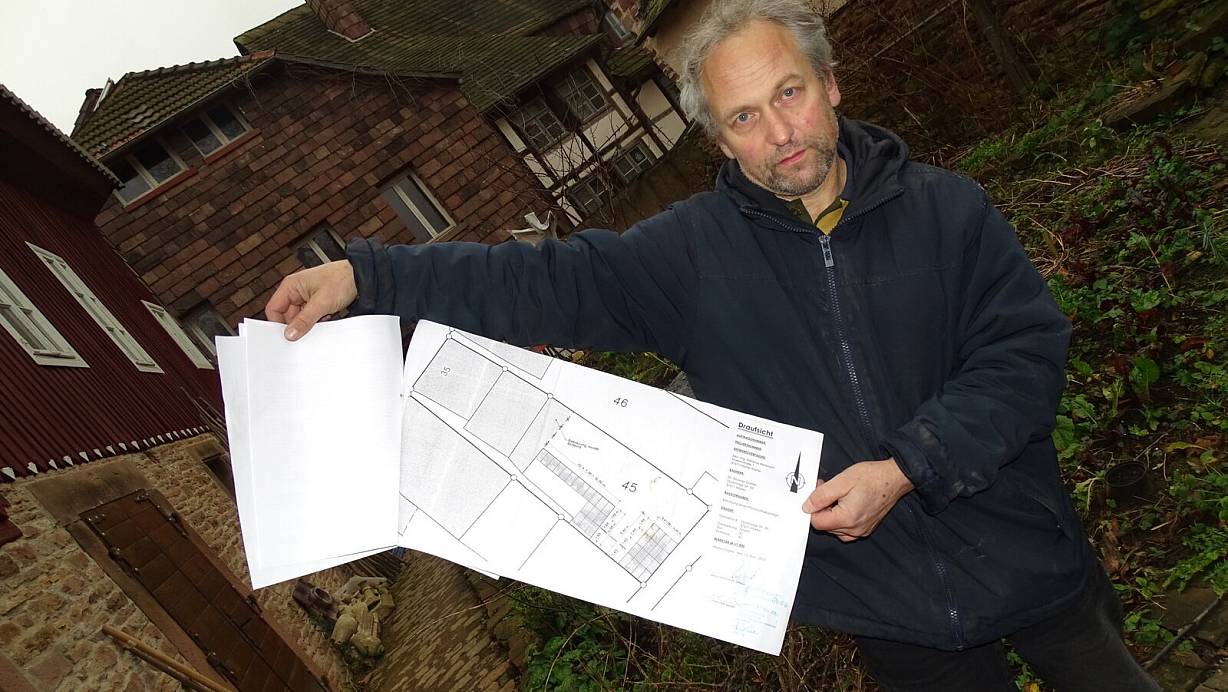 Auf dem Plan, den Thomas Güttler zeigt, ist auch der mit einer PV-Anlage versehene Pavillon zu sehen. Die Anlage sei von der Stadt genehmigt worden. | © Svenja Ludwig