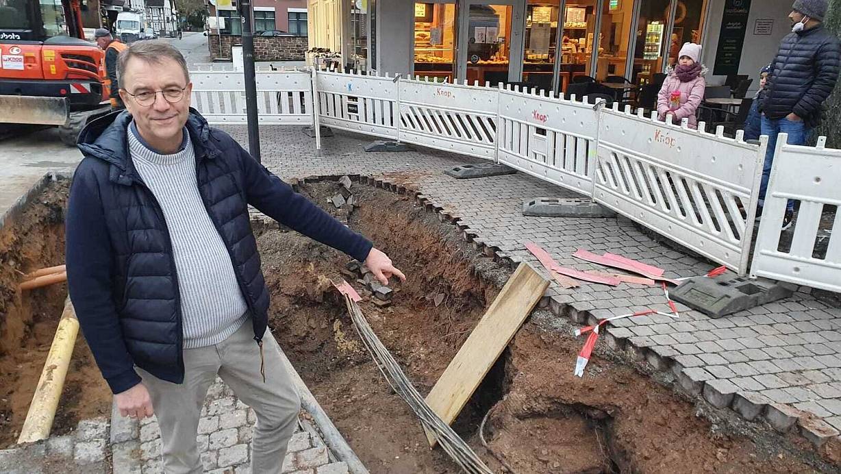Geschäftsführer Elmar Düker zeigt die Stelle vor dem Eingang zur Sparkasse. | © Thomas Kube