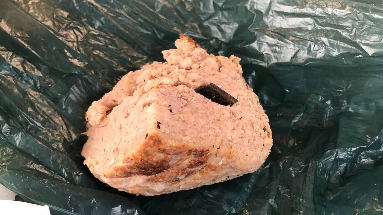 Der Hund nagte bereits an dem auf dem Radweg liegenden Hundeköder, ehe der Besitzer merkte, dass es sich um eine Art Frikadelle handelt, aus der eine scharfe Klinge ragte. Der Hund hatte sich nicht daran verletzt. Der Besitzer informierte die Polizei. In der halben Frikadelle wurden zwei zusammenhängende Abbrechklingen von einem Cuttermesser gefunden.
