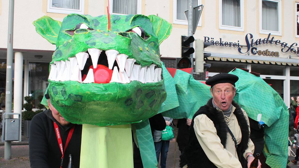 Z wie Zoch: Karnevalsumzüge gibt es einige im Kreis Höxter. Wie hier in Brakel 2020. Dieser gefährliche Drache samt Drachentöter Georg symbolisierte das 1.100-jährige Bestehen der Ortschaft Riesel. | © Manuela Puls
