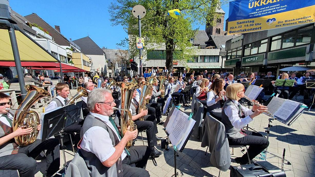 Die Blasorchester aus Bödexen, Brenkhausen und Stahle musizieren für den Frieden und sammeln Spenden. Mit dabei auf dem Marktplatz in Höxter ist auch der 15 Jahre alte Adam, der aus der Ukraine flüchtete.