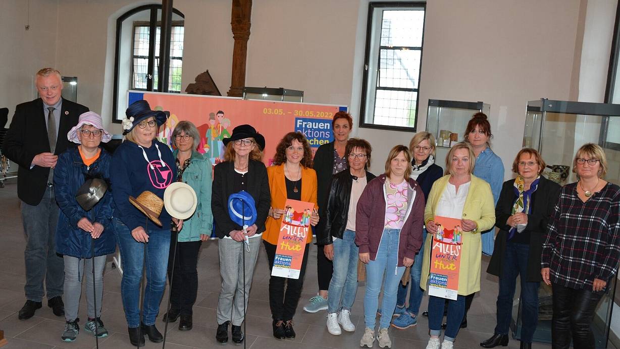 Das Frauennetzwerk Höxter gemeinsam mit Bürgermeister Daniel Hartmann (l.) und der Gleichstellungsbeauftragten Claudia Pelz-Weskamp (r.) stellt das neue Programm der Frauenaktionswochen vor. | © Simone Kube