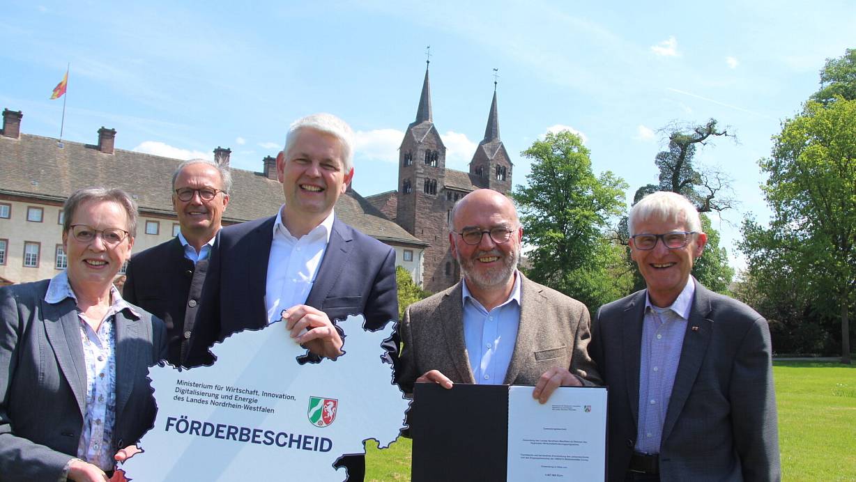 Regierungspräsidentin Marianne Thomann-Stahl (v. l.) , Viktor Herzog von Ratibor, Staatssekretär Christoph Dammermann, Geschäftsführer Michael Funk und Kirchenvorstand Jürgen Kowalski freuen sich über den Förderbescheid. | © Burkhard Battran