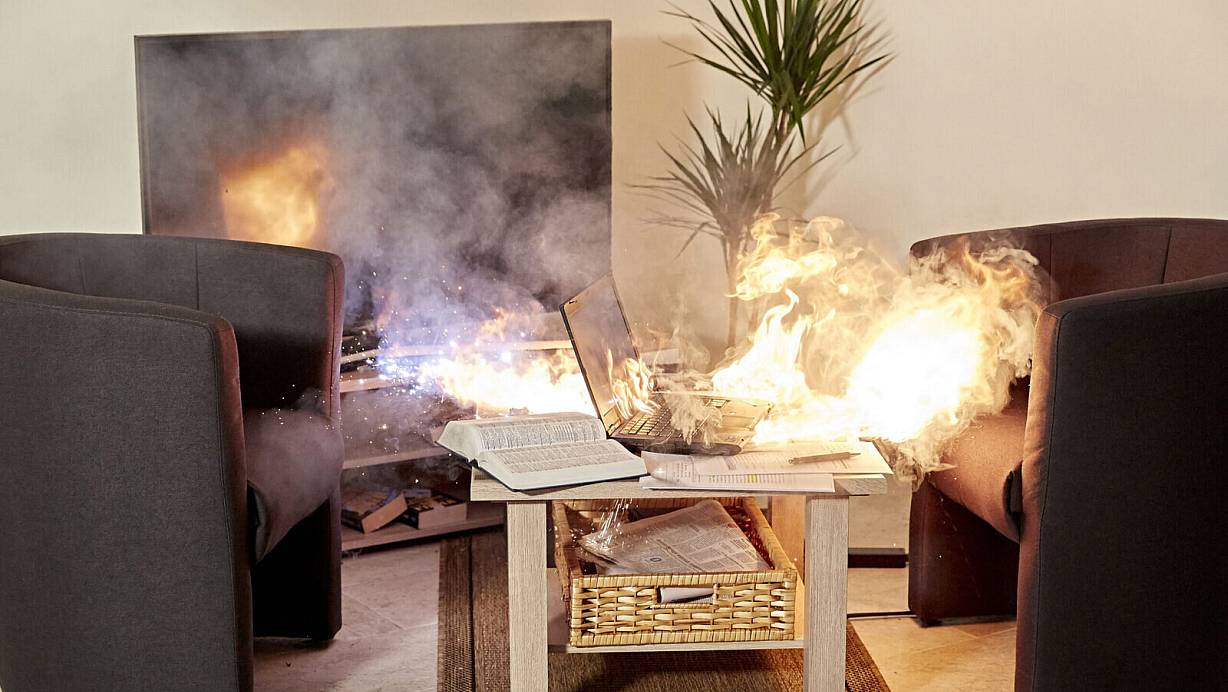 Brennende Lithium-Ionen-Akkus, beispielsweise die eines Laptops, können in der Wohnung verheerende Folgen haben. | © www.ifs-ev.org / Pat Scheidemann