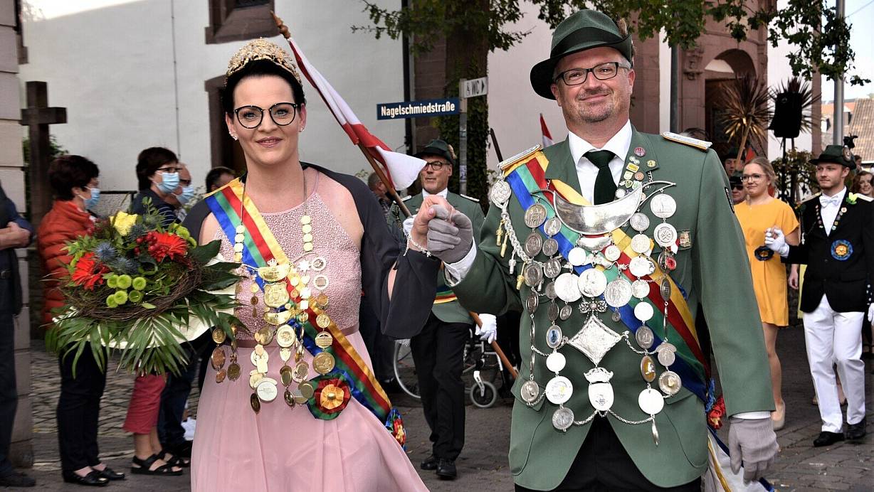 Das Königspaar Sandra Vogt (41) und Frank Wiesemann (46) steuert dem Höhepunkt der Regentschaft entgegen. Er ist Mitglied der Vierten Kompanie und seit 2018 bereits König der Gilde, sie übernahm 2020 die Insignien der Königin von Christine Timmermann. | © Thomas Kube