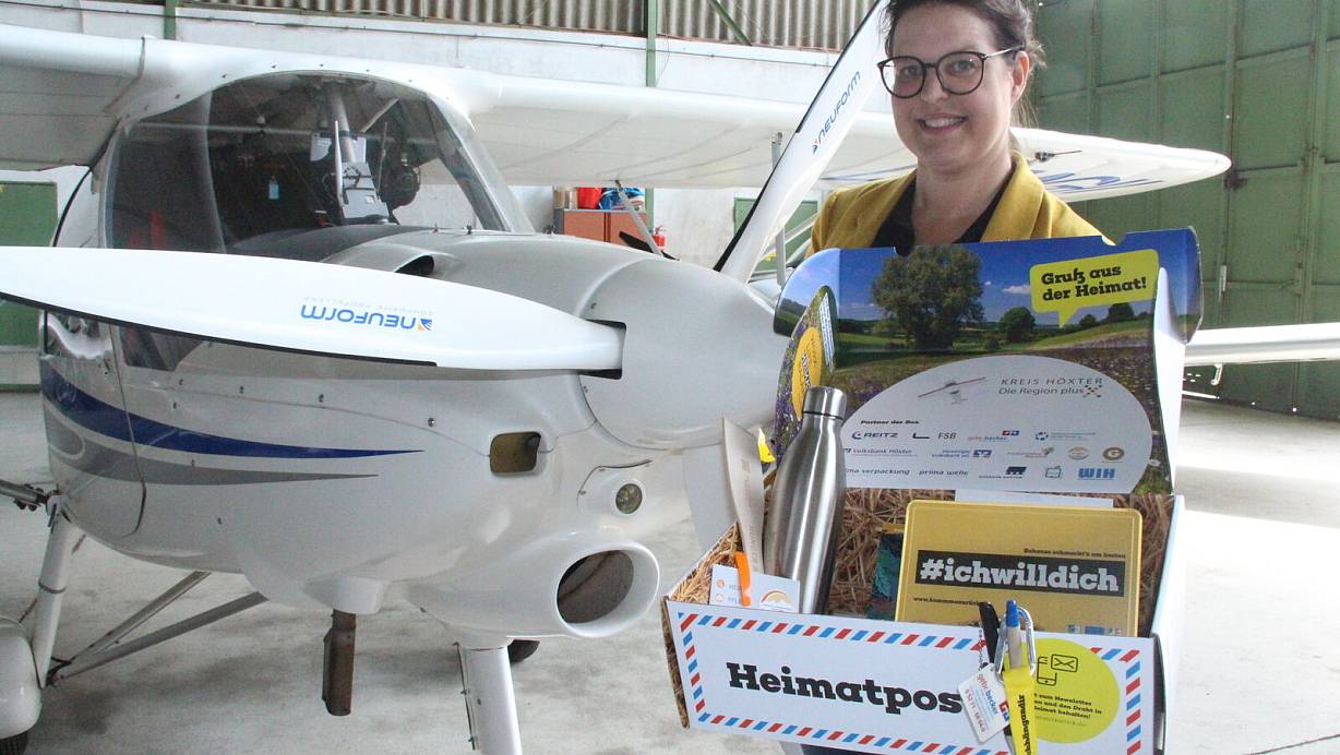Rückkehr-Agenturleiterin Julia Handtke zeigt im Hangar des Höxteraner Flugplatzes, was drin ist in der Heimatbox. | © Burkhard Battran