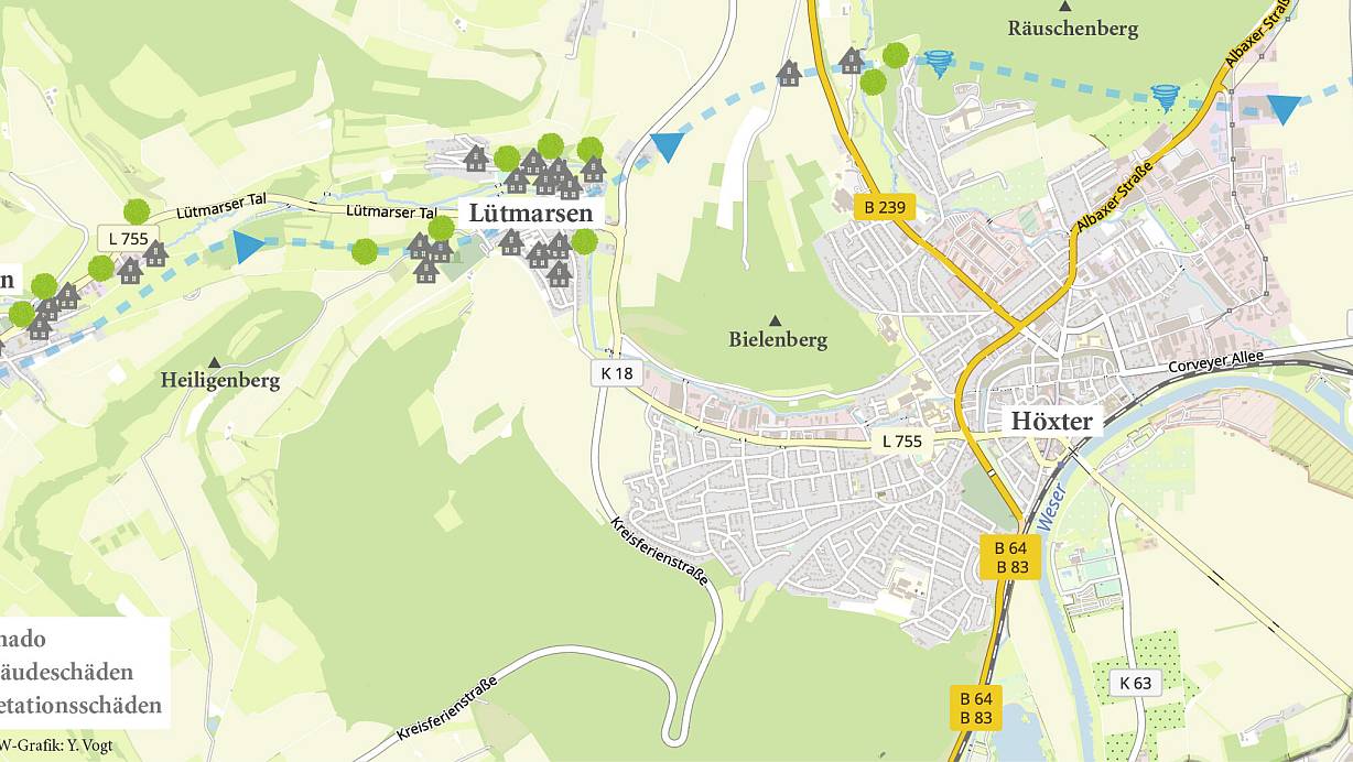 So zog der Tornado durch Ovenhausen, Lütmarsen und Höxter. | © NW Grafik: Yvonne Vogt