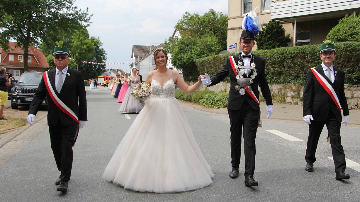 Willebadessen-Peckelsheim. Die Sonne strahlte und das junge Königspaar Daniel Stiene und Mareike Poschmann strahlte zurück. 15 Hofdamen bildeten, neben ihrer in ein leicht glitzerndes, cremefarbenes Kleid gehüllten Königin, den farbenfrohen Mittelpunkt des großen Umzugs am Sonntag.