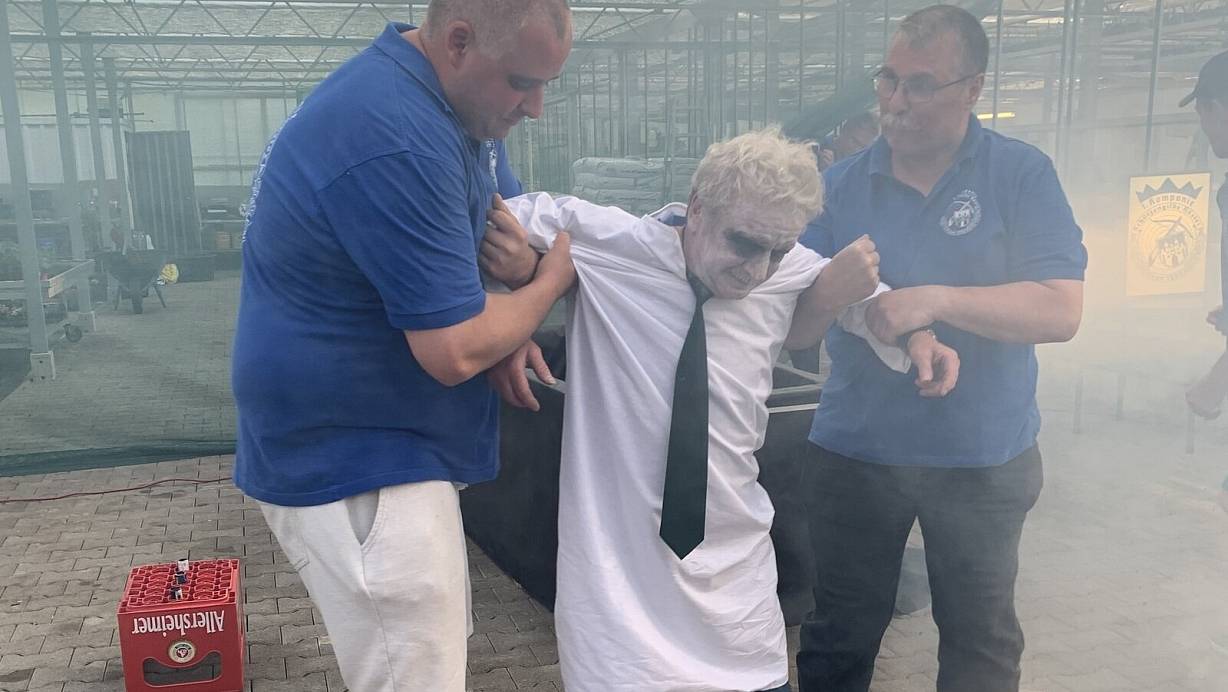 Höxter. Mit einem morbiden Spaß hat die 1. Kompanie der Schützengilde Höxter die Feierlichkeiten zum Jubiläumsschützenfest eingeläutet. Sie erweckten in der Gärtnerei Fahle den Schützenfestgeist zum Leben. Immerhin vier Jahre hat er seit dem letzten Fest im Sarg gelegen. Gänzlich von seinen Kräften verlassen, wurde der Geist Joachim „Stoni“ Steinsiek von den Schützen Werner Zühlke und Mario Ritzenhoff aus dem Sarg gehoben. Sie schafften es mit einer Art Zaubertrank, ihm auf die Beine zu helfen.