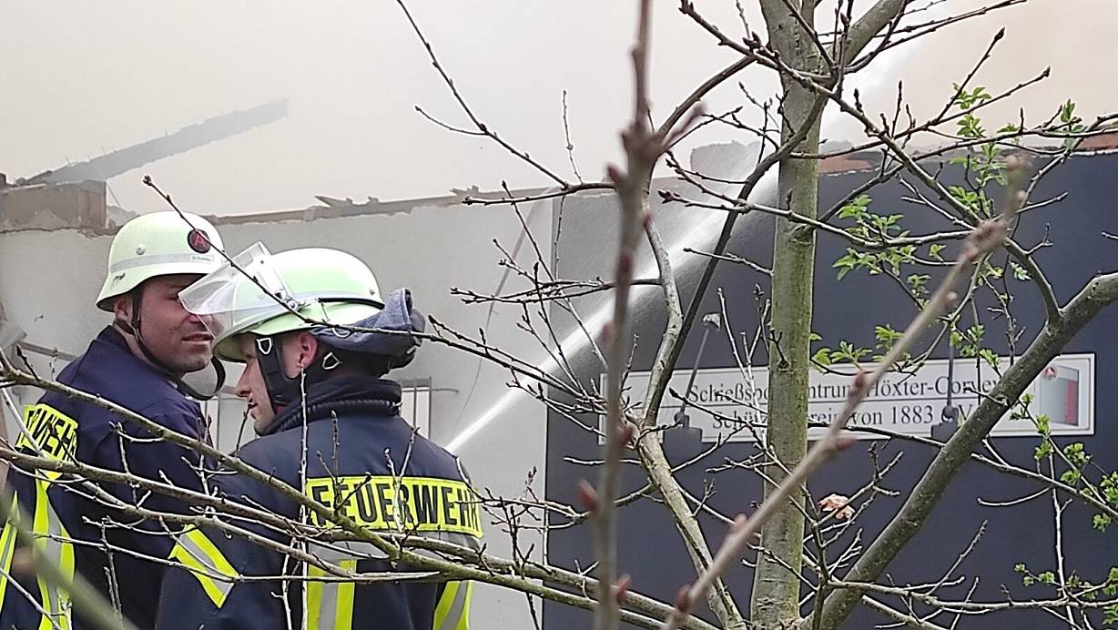Die Feuerwehr löscht das Feuer, das im Vereinsgebäude des Höxteraner Schützenvereins ausgebrochen ist. | © Svenja Ludwig