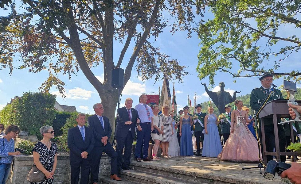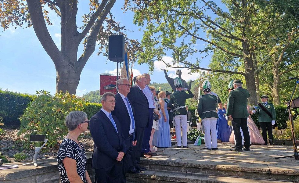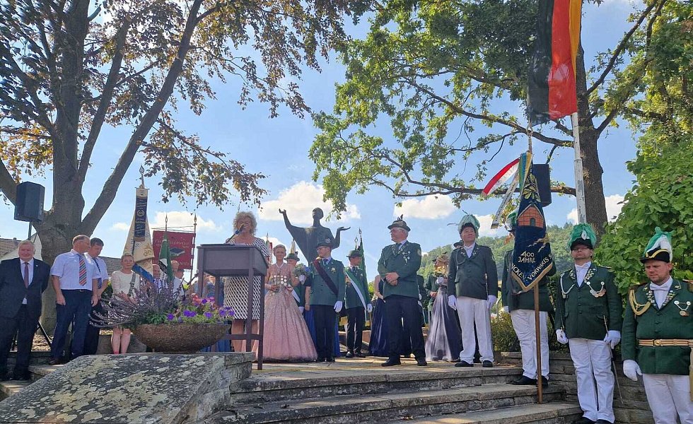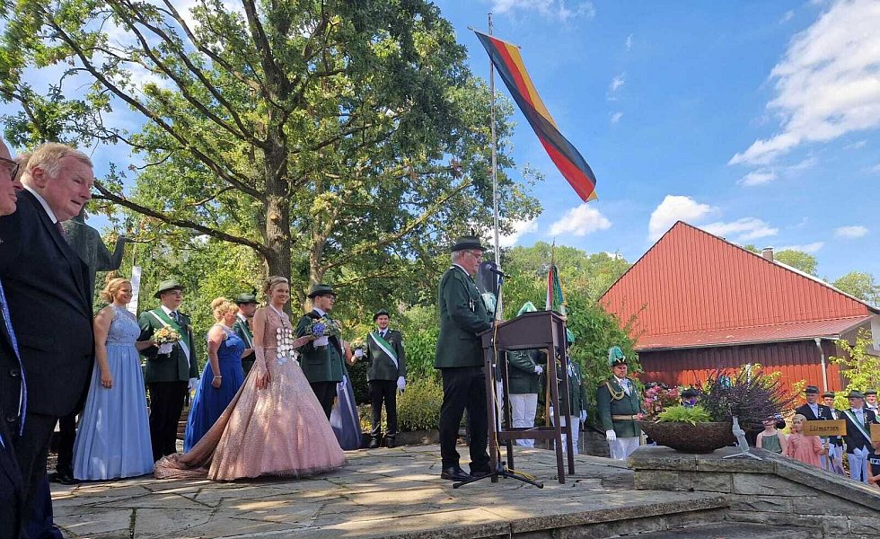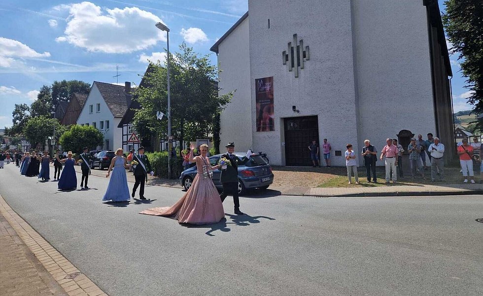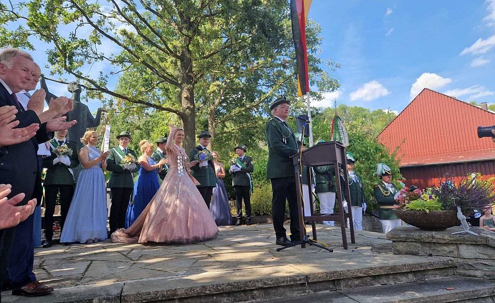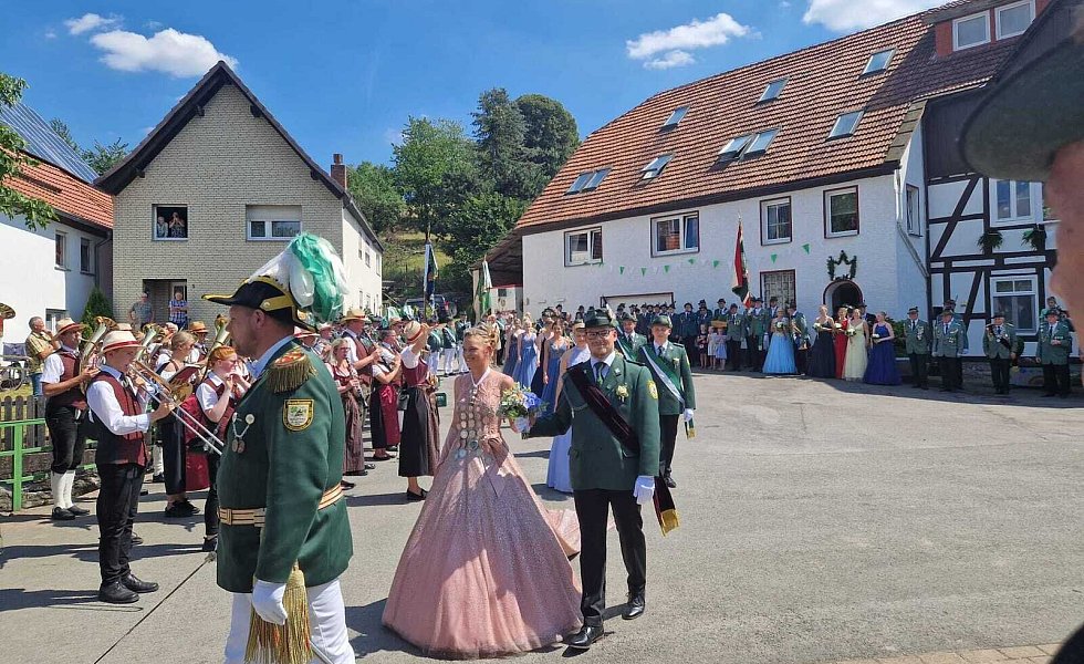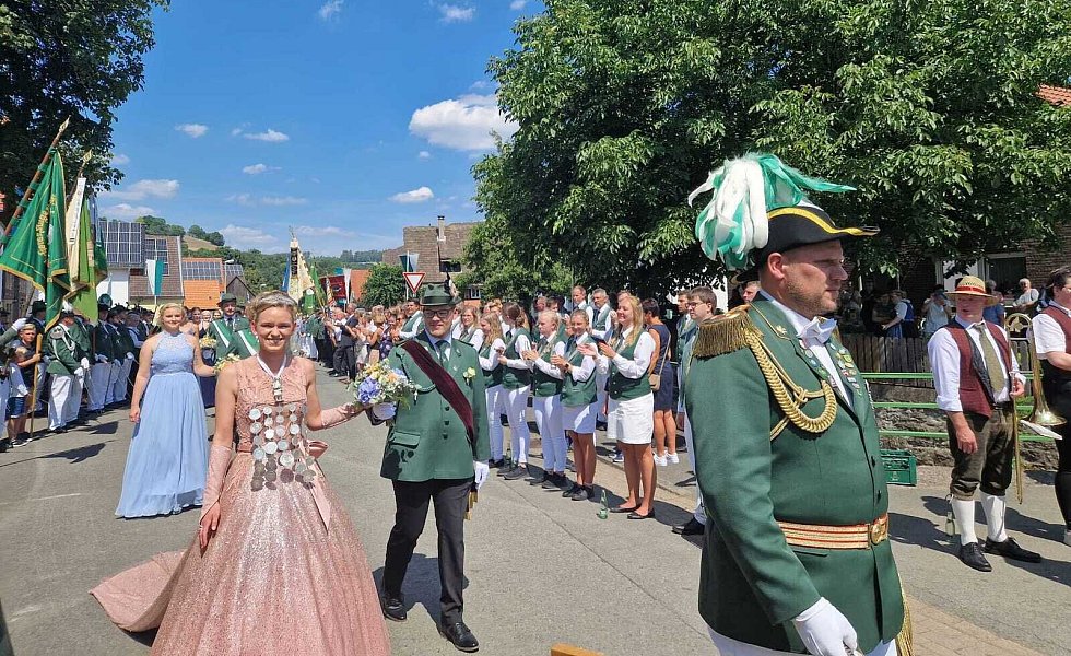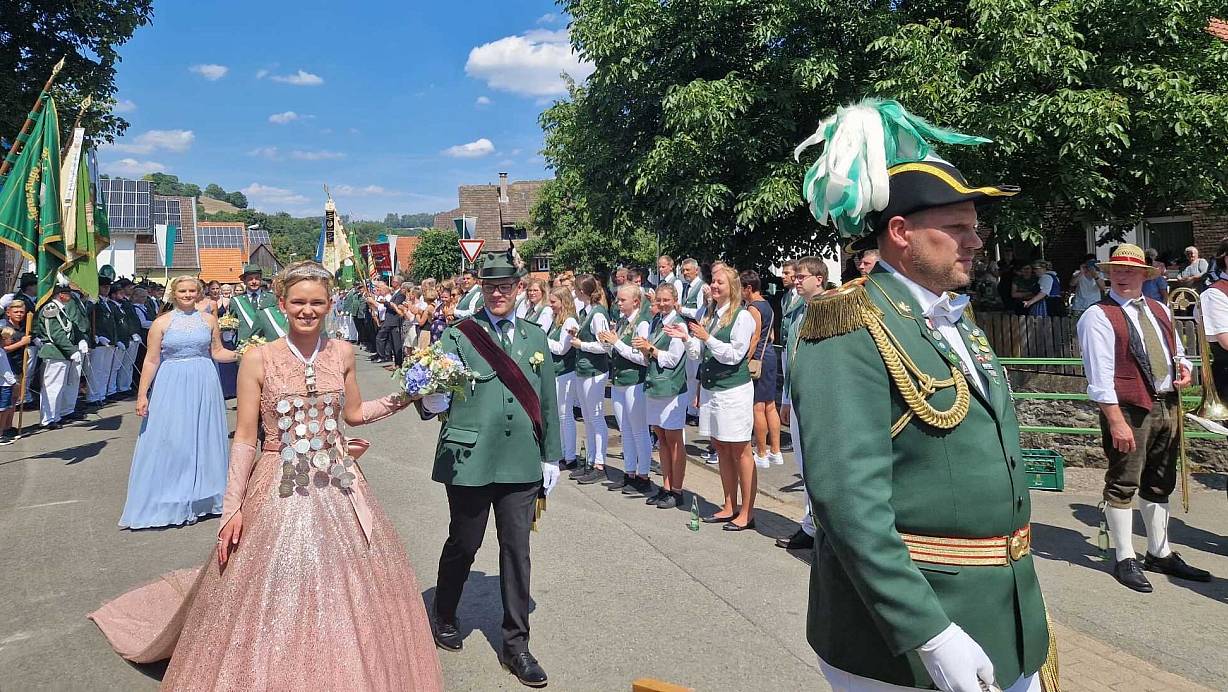 Höxter-Ovenhausen. Der Heimat- und Schützenverein Ovenhausen von 1575 e.V. lud dieses Jahr zu einem ganz besonderen Schützenfest ein. Gemeinsam mit Prinzgemahl Maximilian Knickelmann regiert Nadine Husemann als erste Schützenkönigin. Mit dem 177. Schuss holte die 22-jährige Marineoffizierin beim Königsschießen die Reste des hölzernen Vogels aus dem Kugelfang und schrieb somit die Geschichte des fast 450-jährigen Heimat- und Schützenvereins noch einmal neu.