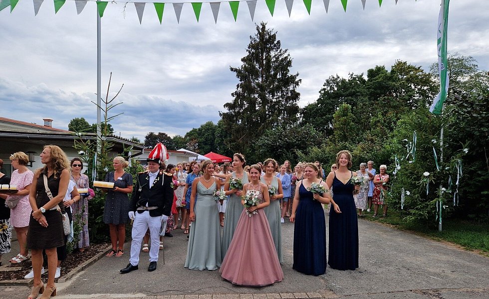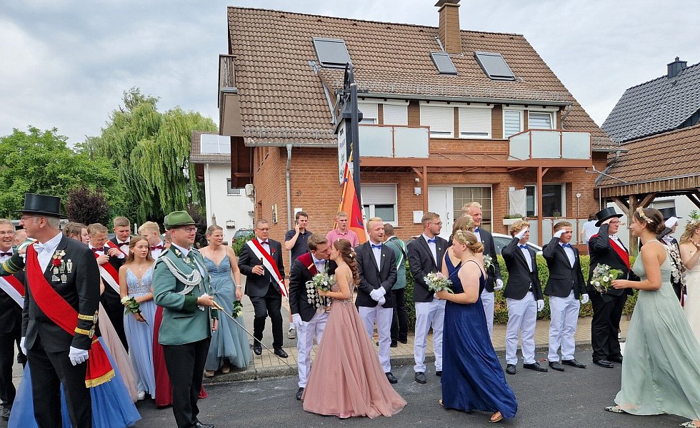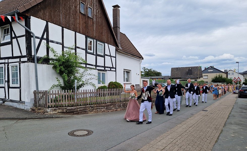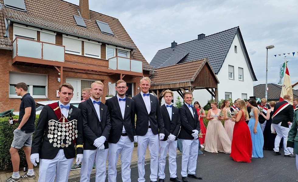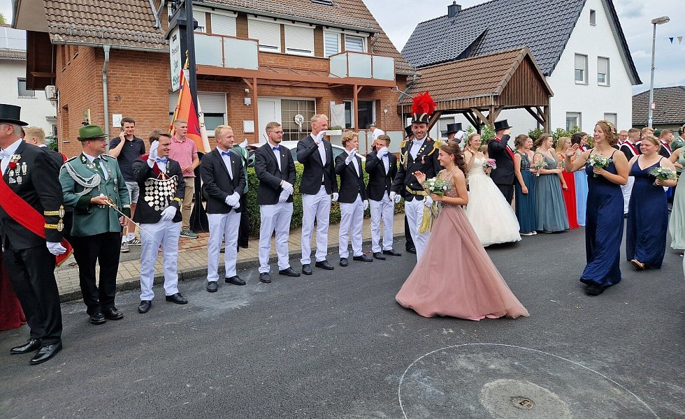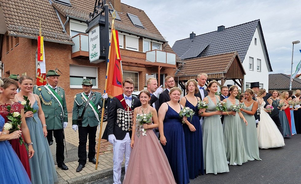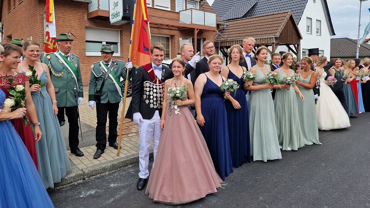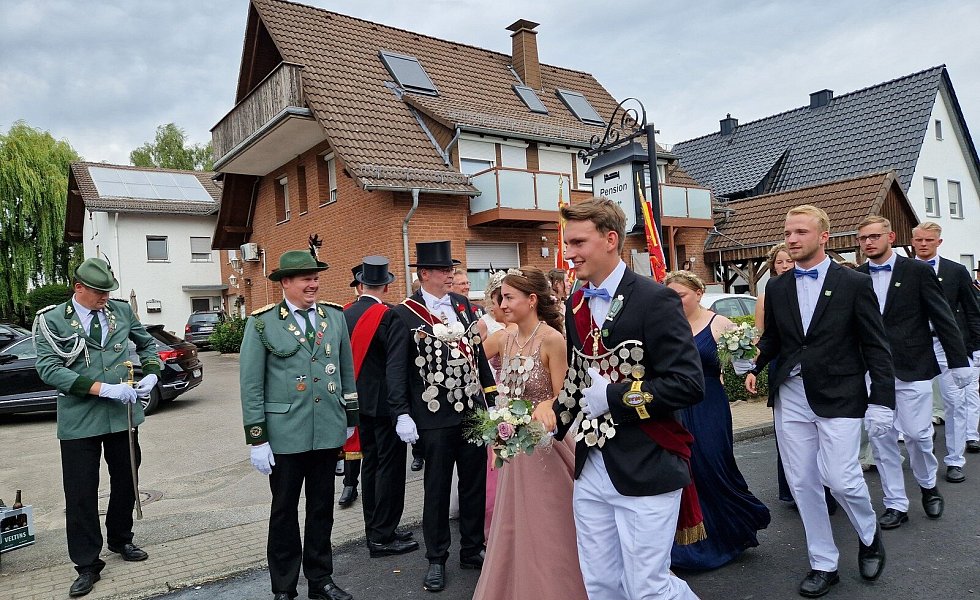 Dabei werden sie von ihrem Hofstaat Paul Siewers, Inga Dormeyer, Jan Peters, Martha Willeke, Kai Siewers, Martina Bode, Finn Heinrichs, Merle Meise, Finn Christoph und Larissa Wulf begleitet. Im großen Festumzug mit den Gastvereinen und Ehrengästen präsentierten sich die neuen Regenten und ihr Hofstaat einem jubelnden Dorf und zahlreichen Gästen.