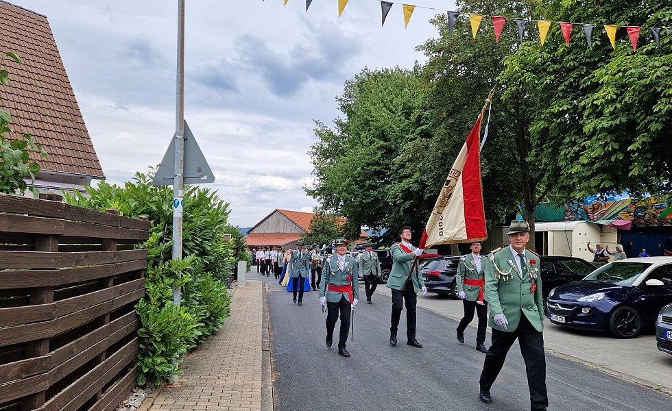 Albaxen. Getreu ihrem Motto „Glaube, Sitte, Heimat“ fügte sich die Schützenbruderschaft Albaxen am Wochenende in die Reihe der Höxteraner Schützenfeste ein. Auch das Dorf vor den Toren Höxters musste coronabedingt 2020 auf ihre Tradition verzichten und somit war die Vorfreude groß, die Girlanden hervorzuholen, die Straßen zu schmücken und endlich wieder zu feiern. Schon von Weitem waren besonders die Damen, die sich traditionell zum gemütlichen Kaffeetrinken vor der großen Festparade trafen, „Wir feiern Schützenfest“ singend zu hören.