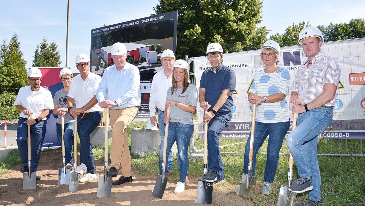 Benjamin Wobig (Johanniter, v. l.), Bauleiter Jaspereit Ratmeyer, Gordon Gattermann, Geschäftsführer der Beermann-Immobilienverwaltung, Bm Daniel Hartmann, Geschäftsführer (Kögel + Nunne Bau GmbH) Dietmar Nunne, Kita-Leiterin Jana Ostermann, Projektentwickler Karsten Burmann, Claudia Pelz-Weskamp und Maik Domeyer (Projektleiter Erdbau Hake) | © Thomas Kube