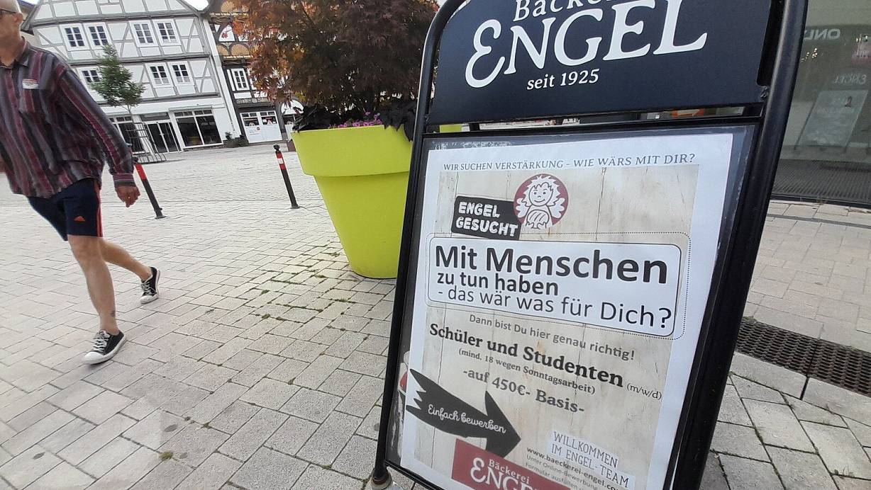 Überall werden im Handel und in der Gastronomie Arbeitskräfte gesucht - wie hier in Höxter auf dem Marktplatz mit einem Aufsteller einer Bäckerei. | © Simone Flörke