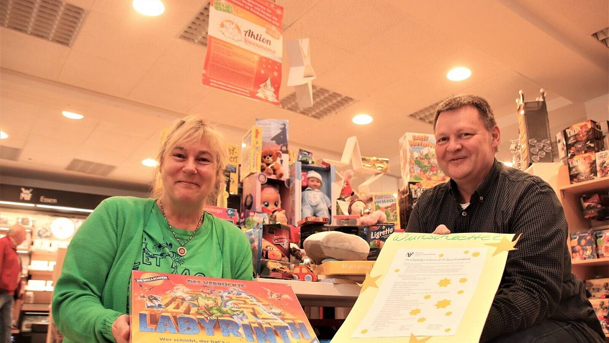 Wollen schwerkranke Kinder und ihre Familien beschenken: Löwenmama Susanne Saage und Dietmar Laursch am Geschenketisch im Höxteraner Spielwarengeschäft. | © David Schellenberg