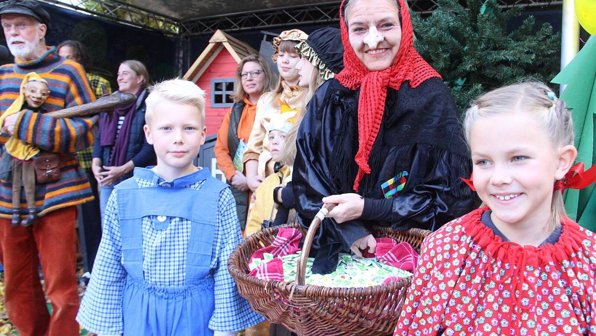 Die gar nicht böse Hexe Kathrin Polzin verteilt zusammen mit Hänsel und Gretel Süßigkeiten. | © Burkhard Battran