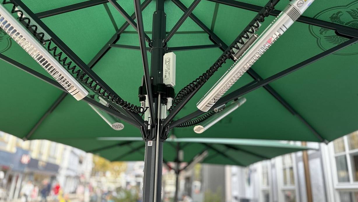Sonnenschutz mit Heizung: Die Cafe-Bar "Die Apotheke" ist auch auf kältere Temperaturen vorbereitet. | © Ralf T. Mischer