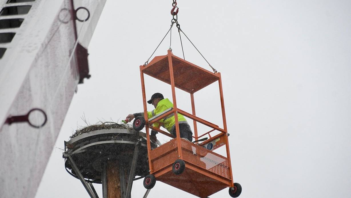Nachdem der Stamm an seiner endgültigen Position sicher montiert war, beförderte der zweite Kran Hubert Drüke in die Luft, um das Nest mit Heu auszupolstern und bezugsfertig zu machen. Und dann wars auch geschafft: Nun wartet der Freundeskreis Grubestörche gespannt auf die Rückkehr der Störche aus dem Winterquartier und hoffen, dass das neue „Wohnzimmer“ von Ovo und Antje – so der Name der beiden Ovenhäuser Störche – angenommen wird.