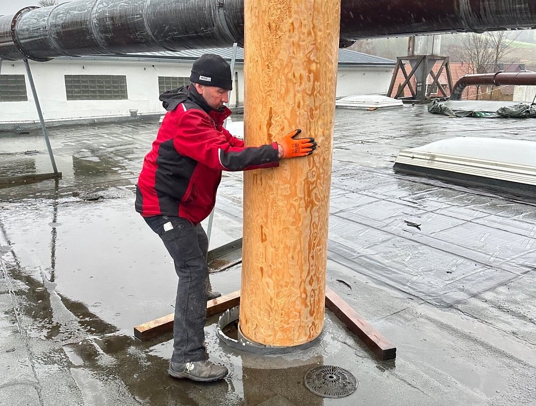 Eine gut gewachsene prächtige Lärche mit 30 Meter Länge, rank und schlank mit einem unteren Stammdurchmesser von 70 Zentimeter wurde schließlich gefunden. Dann folgte Knochenarbeit: Der Natur-Lärchenstamm musste komplett geschält und auf seiner endgültigen Länge von 16,50 Meter angepasst werden. Es musste zudem wegen der Korrosionsschäden und der anderen Maße noch ein neuer Metallunterbau her.