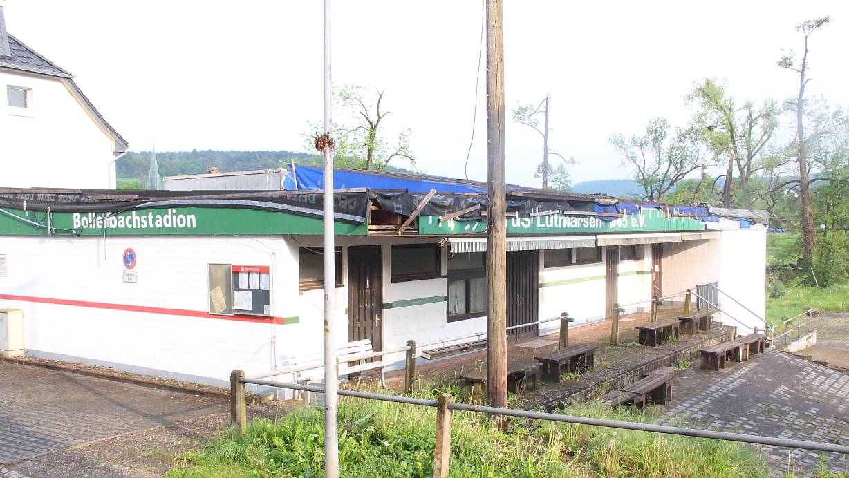 Das vom Tornado zerstörte Sportheim in Lütmarsen mit dem dahinterliegenden Feuerwehrgerätehaus. Seit einem Jahr wartet die Stadt auf das Geld zum Wiederaufbau. | © Burkhard Battran