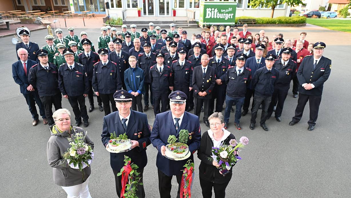 Er überraschte die beiden Kameraden, die nach über 40 Jahren Einsatzdienst, davon lange als Löschgruppenführer oder Stellvertreter im Amt, nun in die Ehrenabteilung der Feuerwehr gewechselt sind. Auf dem Hof des Dorfgemeinschaftshauses versammelt hatte sich der gesamte Löschzug, bestehend aus den Löschgruppen Godelheim, Bruchhausen und Ottbergen, Vertreter der Politik sowie der Spielmannszug und die Blaskapelle Godelheim, die den Festakt musikalisch umrahmt haben.