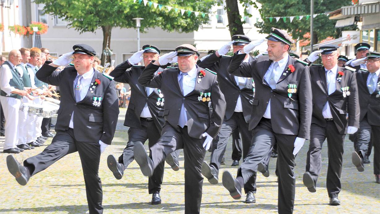 Denn Stechschritt können die Steinheimer Bürgerschützen perfekt. So marschieren sie normalerweise an ihrem König vorbei. Am Wochenende wäre es eigentlich wieder soweit - aber keiner wollte Regent werden. | © Madita Schellenberg