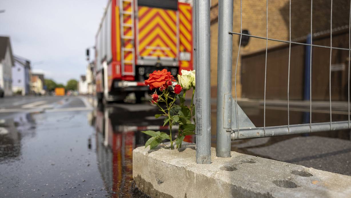 Blumen stehen an dem Absperrgitter in der Straße in Sankt Augustin, wo am Sonntag ein Motorradgeschäft brannte. Dabei starben zwei Feuerwehrleute. Die Anteilnahme bei der Feuerwehr im Kreis Höxter ist groß. | © Thomas Banneyer