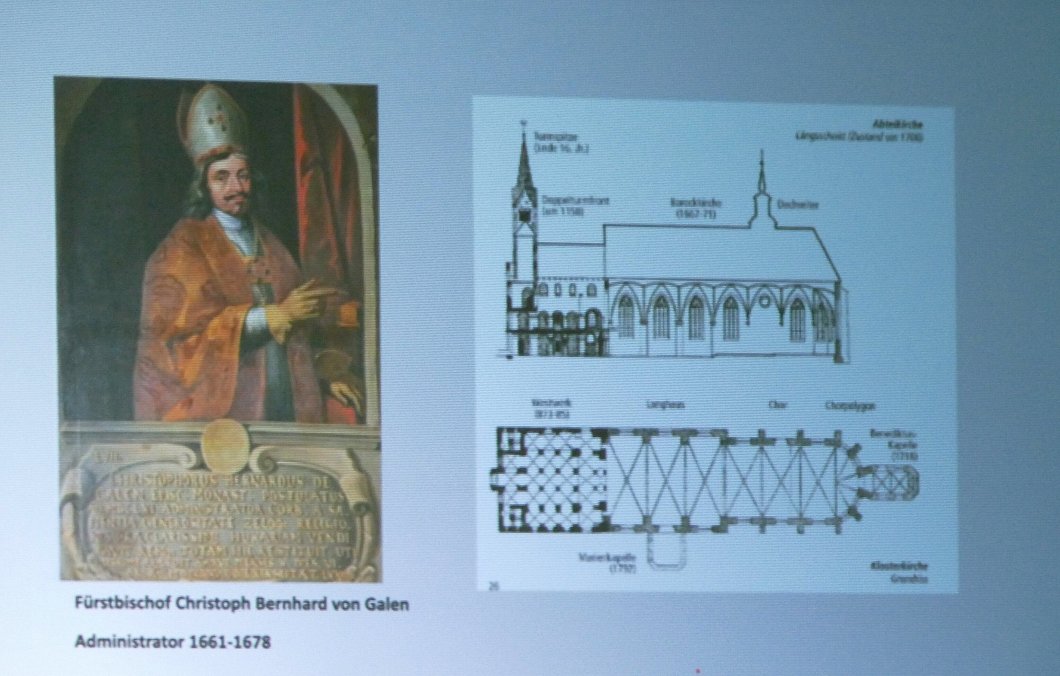 Stiegemann verdeutlichte mit Worten und starken Bildern nicht nur den Planungs- und Schaffensprozess, sondern auch die Geschichte Corveys und die Bedeutung einzigartiger künstlerischer Glaubenszeugnisse aus 1.000 Jahren Klosterzeit. Die 1974/1975 bei Grabungen zum Vorschein gekommenen Fragmente eines Wellenrankenfrieses aus der Zeit vor 844 schmückten die Untergeschossdecke der Scheitelkapelle des Gründungsbaus der Klosterkirche.
