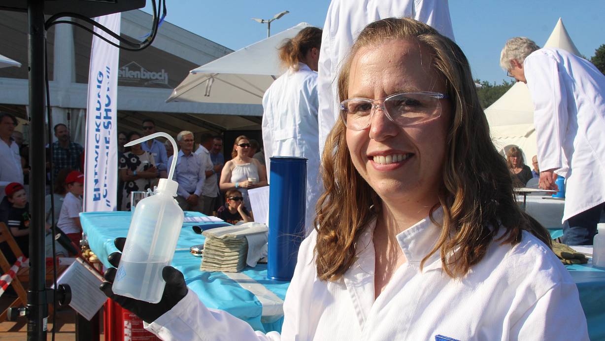 Chemielaborantin Julia Zurmühlen und Kolleginnen und Kollegen unterhalten die Besucher mit einer kleinen Science-Show. | © Burkhard Battran