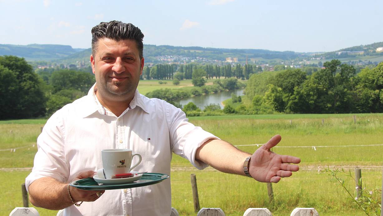 Gastronom Mahmut Akman auf der Sonnenterasse des Steinkrugs mit dem überwältigenden Blick auf Höxter und das Wesertal. | © Burkhard Battran