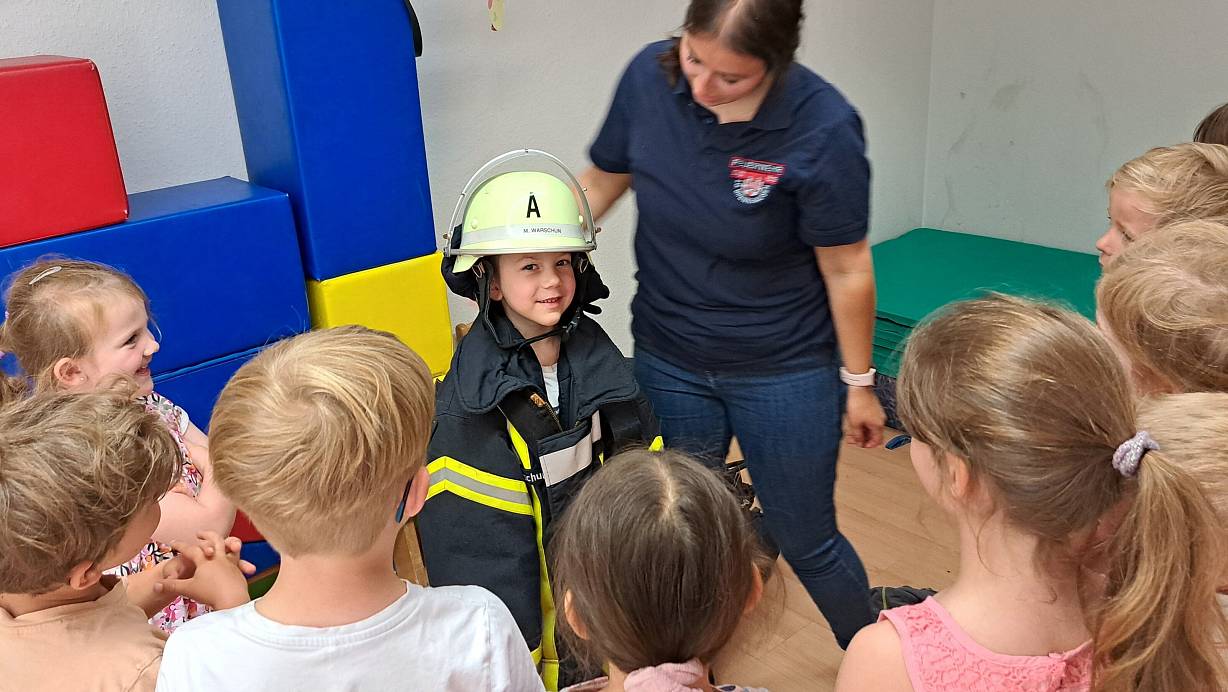 Ein besonders Highlight für die Vorschulkinder: Sie dürfen selbst die Feuerwehr-Ausrüstung tragen. | © Matthias Reiprich