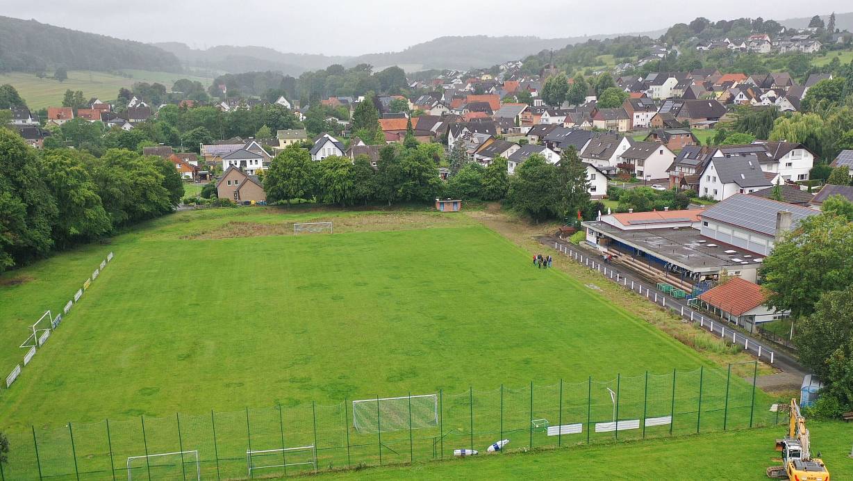 Blick von oben: Zuerst wird der Bagger den Rasen entfernen, später wird er Erde abtragen, um Platz für die Drainage und den Kunstrasen zu schaffen. | © Thomas Kube