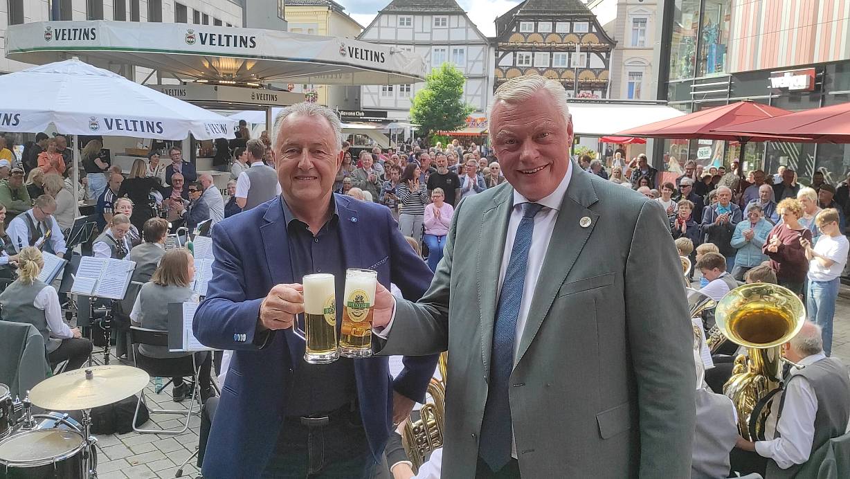 Werbegemeinschaftsvorsitzender Jürgen Knabe (l.) stößt bei Huxori mit Bürgermeister Daniel Hartmann an. | © Svenja Ludwig