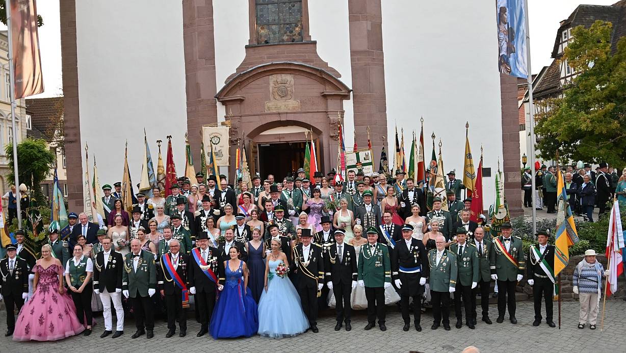 Gruppenbild mit Fahnen: Die Majestäten und Vertreterinnen und Vertreter der 30 anwesenden Schützenvereine haben sich für ein gemeinsames Foto versammelt.
