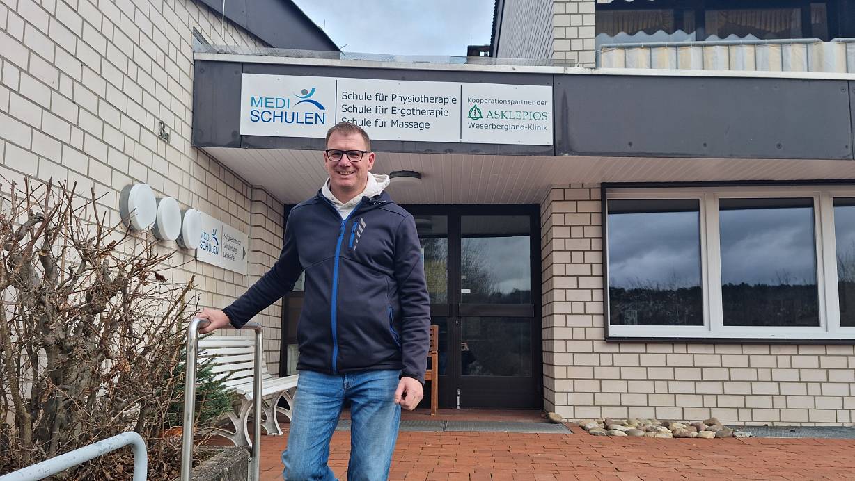 Mirko Niederprüm vor den Räumlichkeiten der Medischulen in Höxter, wo sowohl Reha-Sport, als auch die Sitzungen der "Support-Gruppe" für Betroffene stattfinden. | © Yannick Sonntag(LZ)