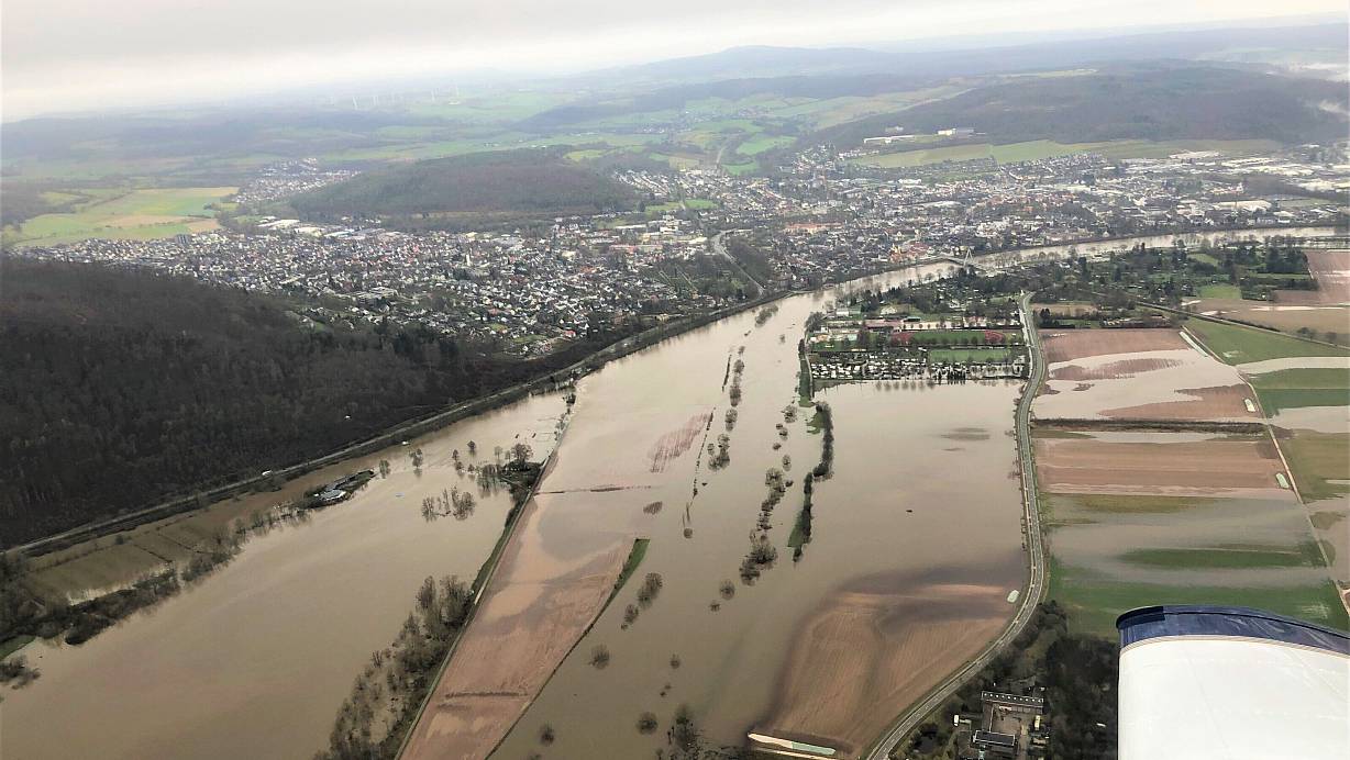 Die Godelheimer Seen als Seenlandschaft aus der Perspektive von Pilot Christopher Döring vom Verein Luftsport Höxter, der am 27. Dezember gegen 10.30 Uhr mit seinem Flugzeug über der überfluteten Region unterwegs war und fotografierte. | © Christopher Döring