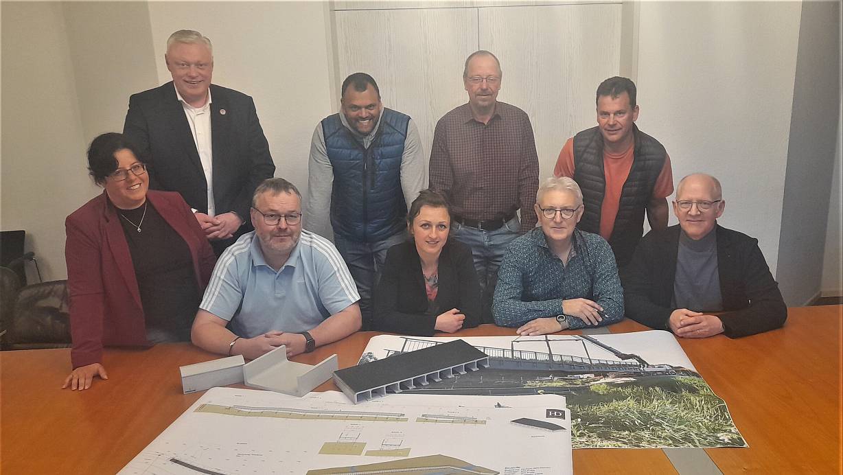 Baudezernentin Claudia Koch (v. l.), Bürgermeister Daniel Hartmann, Bruno Kieneke (Brückenplanung), Edison Buch (Bödexen), Maja Beineke (Stadt Höxter), Ferdinand Welling (Fürstenau), Reinhold Hoppe (Straßenplanung), Rainer Buch (Bödexen) und Ulrich Tilly (Bezirksregierung). | © Simone Flörke