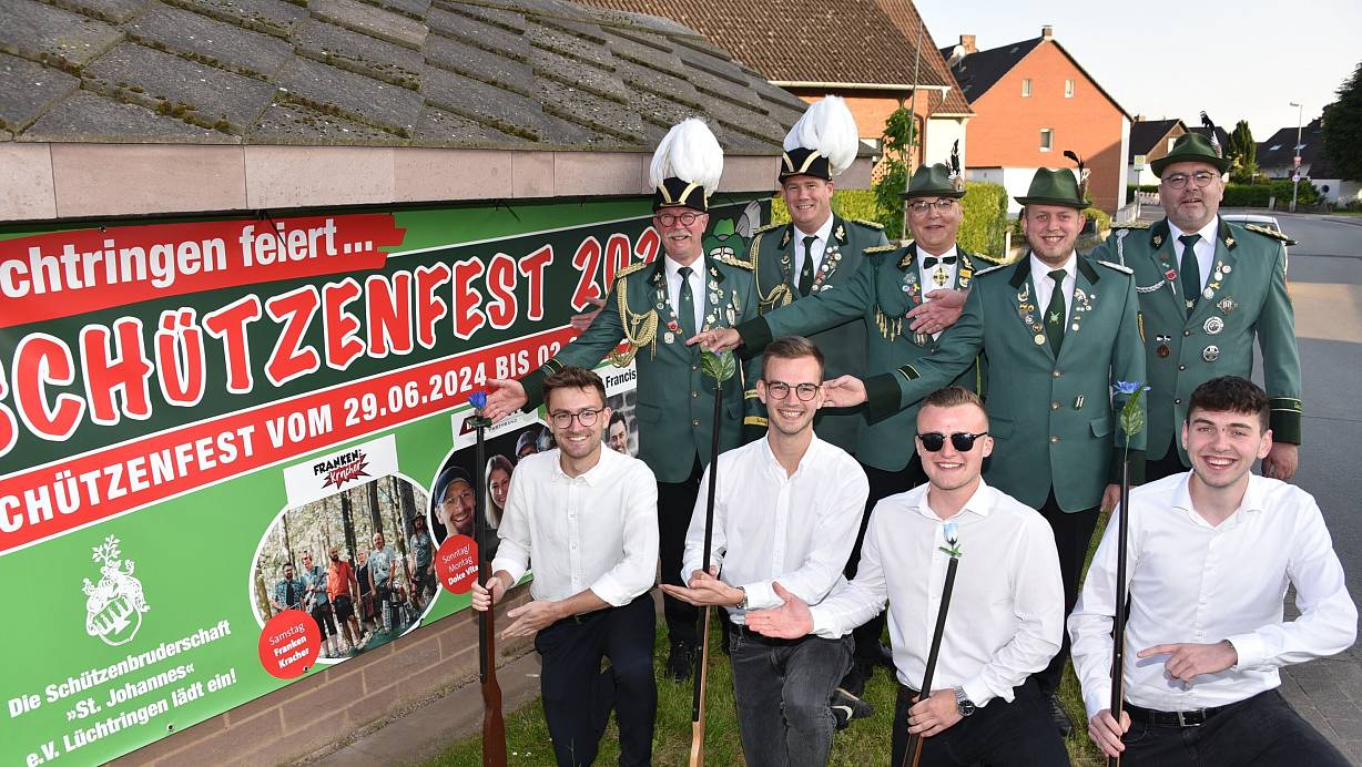 Der Vorstand der Schützenbruderschaft präsentiert das fünftägige Schützenfest Lüchtringen: Franz-Josef Risse (hinten, v. l.), Alexander Fahrenholz, Thomas Beverungen, Frederik Risse, Björn List sowie Luca Ebeling (vorn, v. l.), Leander Pires, Jonas Schröder und Fynn Reinhard. | © Thomas Kube