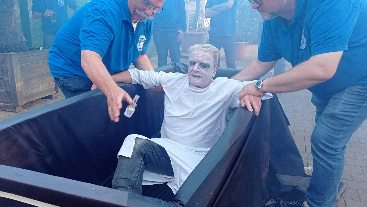 Zwei Jahre hat er geschlafen, nun ist er wieder erwacht. Die 1. Kompanie erweckte ihn während des Gewehrreinigens in der Gärtnerei Fahle zum Leben. Wieder war er gänzlich von seinen Kräften verlassen und wurde daher von den Schützen aus dem Sarg gehoben. Der altbewährte Zaubertrank mit tatkräftiger Unterstützung von Werner Zühlke und Axel Kochniß half ihm auf die Beine.