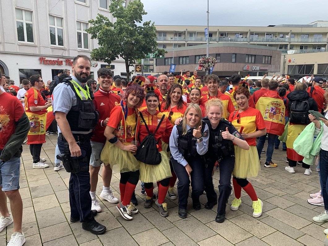 Wieder andere waren in den Stadien selbst direkt bei den Fans. „Alle waren sie beeindruckt von der Stimmung und tollen Atmosphäre. Die Menschen haben fröhlich, friedlich und ausgelassen gefeiert“, so der Polizeisprecher nach Rücksprache mit den Kolleginnen und Kollegen. „Wir hoffen, dass die weiteren Spiele und Einsätze so friedliche bleiben, wie wir das bisher erlebt haben“, so Polizeidirektor Christian Brenski.