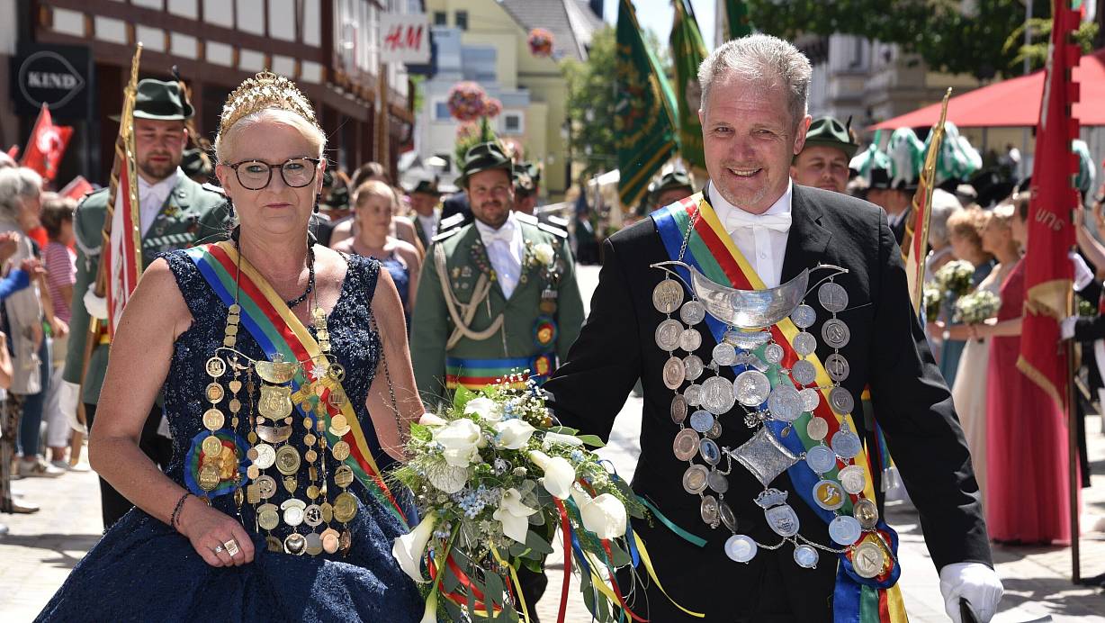 Höhepunkt der dreitägigen Festlichkeiten ist der große Umzug, bei dem das Königspaar Dieter und Martina Kuhlebrock zum letzten Mal eine große Bühne bekommen hat. An diesem Montag wird es spannend, wenn die neue Königin vorgestellt wird.