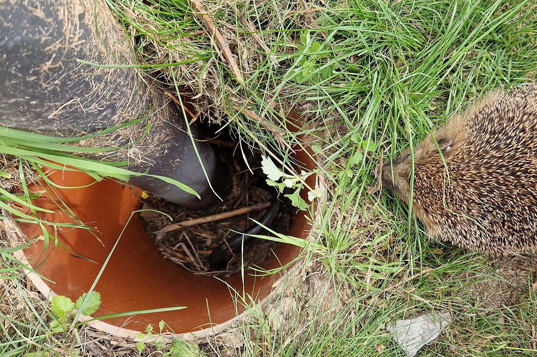 Dabei fiel ihr am Wochenende ein Igel in einem etwa 30 Zentimeter tief gelegenen Kunststoffrohr auf, aus dem eine der neu installierten Laternen erwächst, die sich an der Weserpromenade der Unterführung zur Bachstraße befindet. Der Igel hockte dort bereits drei Tage und wäre ohne Hilfe aus dem Rohr nicht wieder heraus gekommen. Am dritten Tag war er zudem auch noch unter einem dicken Kabel eingeklemmt, das in dem Rohr von der einen Seite zur anderen führte.
