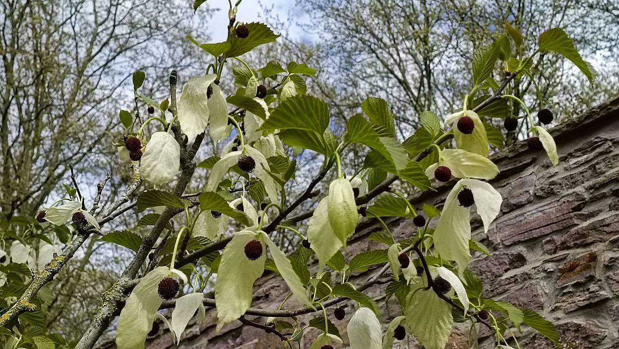 Extreme Kälte und Wind verträgt auch der Taschentuchbaum nicht. Der sehr ausladende Eyecatcher steht unweit des ältesten Bauwerks Westfalens. „Während der Blütezeit sieht es aus, als hätte jemand Taschentücher in die Krone geworfen.“ Diese „Blüten“ sind aber eigentlich nur verfärbte Hochblätter, wie man es auch vom Blumenhartriegel kennt, der natürlich ebenfalls im Remtergarten zu finden ist. „Beim Cornus braucht man Geduld, wenn er sich erst eingelebt hat, ist er total blühsicher.“