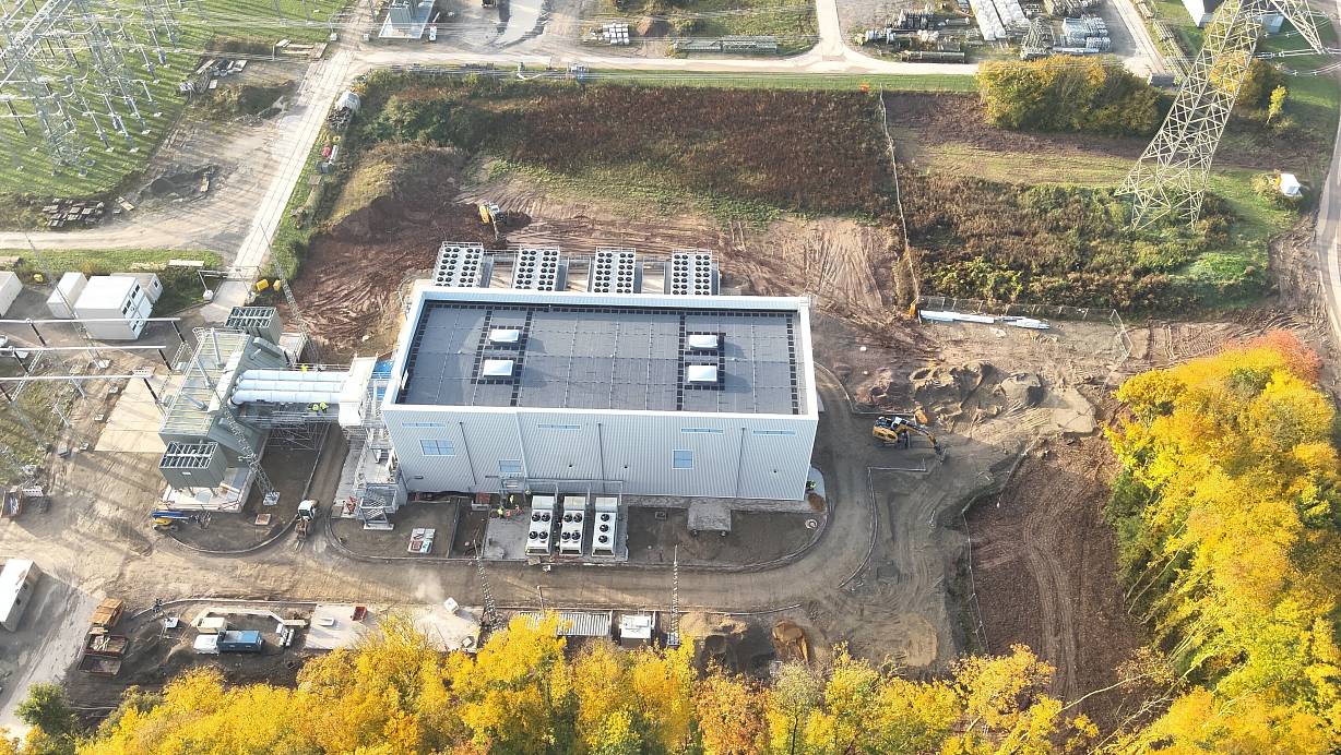 Riesige Halle: Der Blick aus der Luft täuscht: Die Maschinenhalle, in der sich der Phasenschieber befindet, hier während der Bauphause, ist mehrere Stockwerke hoch. Mitterweile stehen auch rund um die Halle etliche weitere Anlagen. | © Tennet